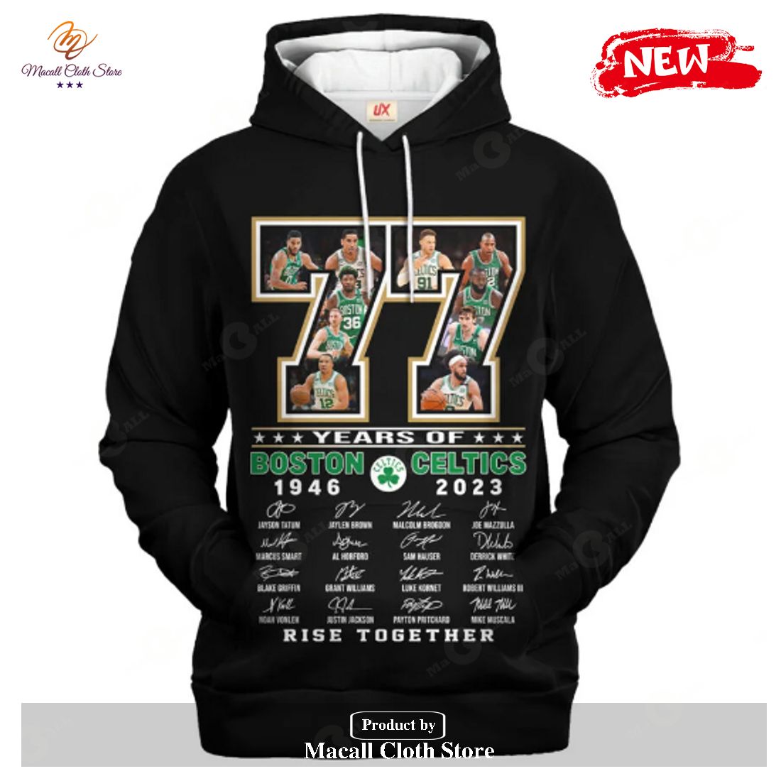 This 77 Years Of Boston Celtics 1946 2023 Signatues Rise Together Jogger Hoodie Sweatshirt 3D is a must-have item for any Celtics fan. The hoodie sweatshirt features a bold design that captures the illustrious history of the Boston Celtics. The black base of the hoodie is contrasted by a striking green and white star pattern, and featured on the chest is an 18-inch Boston Celtics metal logo that proudly showcases the championship rings earned over the years. The back of the hoodie includes a signature collection of the most famous Celtics stars, guaranteeing you won’t find this item anywhere else. The jogger fit of the hoodie provides both warmth and comfort so you can show your team spirit in style. No matter your size, the adjustable drawstrings mean you can find the perfect fit. Perfect for game days and casual events alike, this hoodie is sure to become your go-to apparel item for years to come.