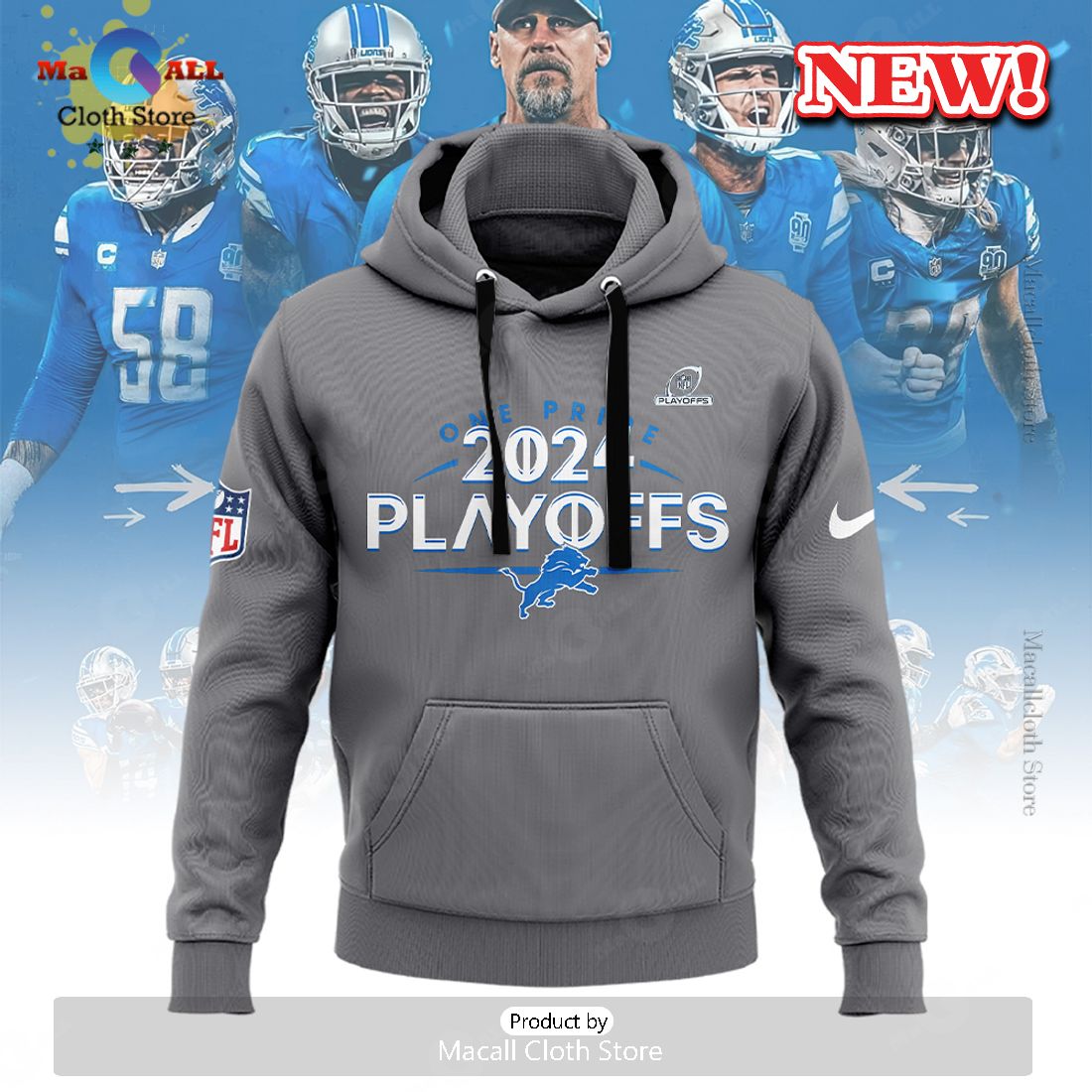 HOT Detroit Grey Nike 2024 NFL Playoff V2 Black Hoodie 3D Information: