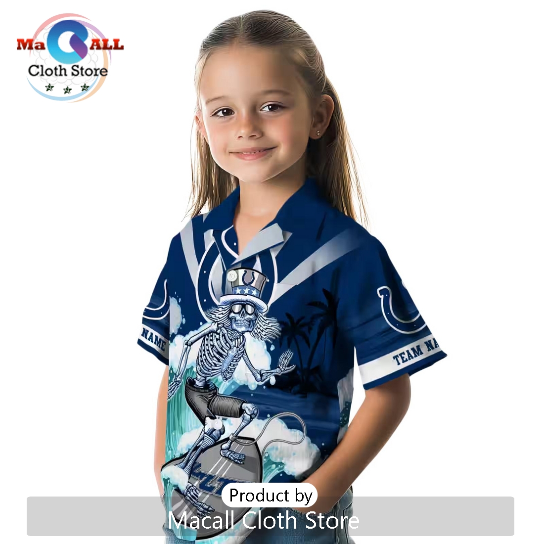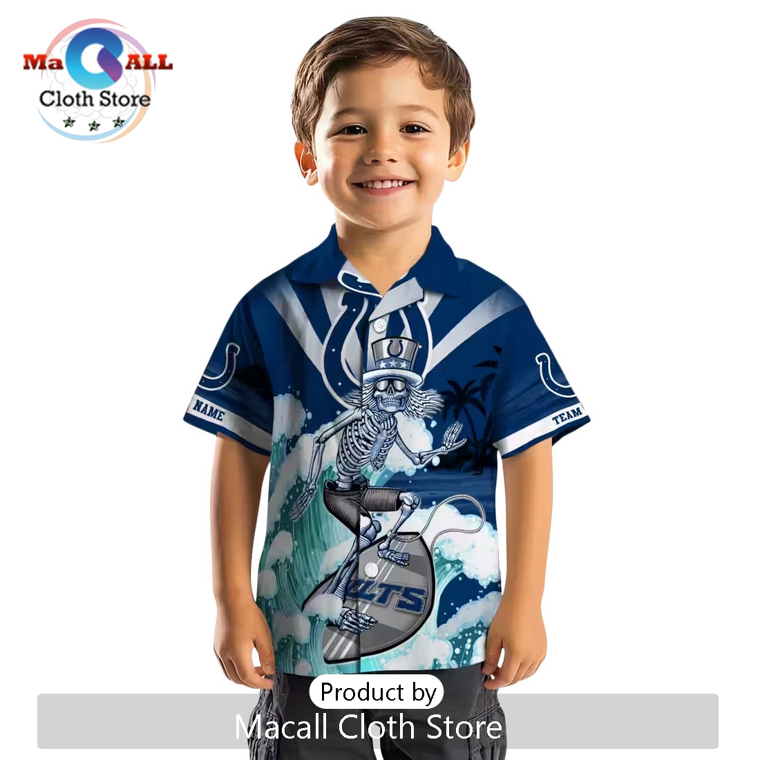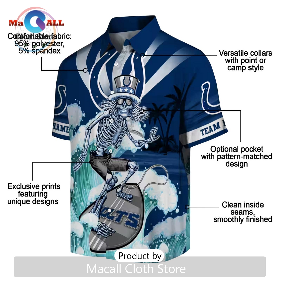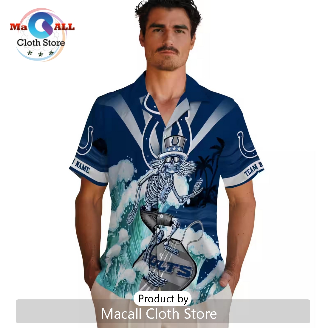 Indianapolis Colts Blue Surfing Skeleton Hawaiian Shirt Information: