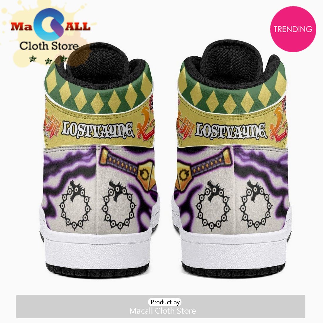 The Meliodas Lostvayne Seven Deadly Sins JD1 High Top Shoes are the perfect choice for any fan of the popular manga and anime series, Seven Deadly Sins. These shoes are designed with comfort and style in mind, making them a must-have for any wardrobe. The shoe features the iconic Lostvayne symbol on the side, representing the powerful Demon King Meliodas and his weapon of choice. The shoes are made with high-quality, durable materials that ensure long-lasting wear and provide support for daily activities. Additionally, the shoes are designed with a high-top silhouette, providing extra support for the ankles. The vibrant colors and unique design make these shoes stand out in a crowd and are sure to be a conversation starter among fellow fans. Whether you’re headed to a convention or just out and about, the Meliodas Lostvayne Seven Deadly Sins JD1 High Top Shoes are the perfect way to show off your love for the series while staying comfortable and stylish.