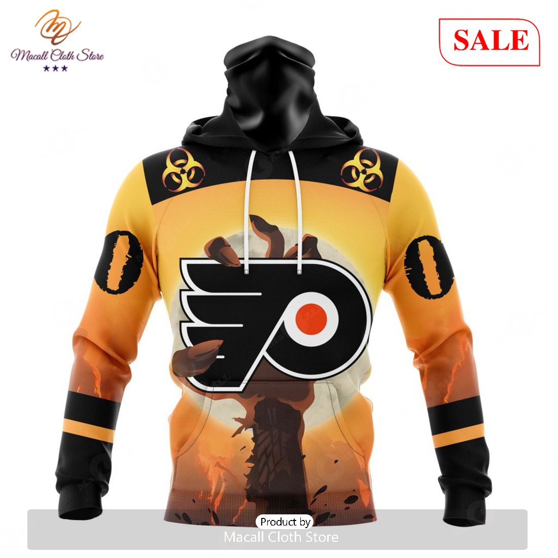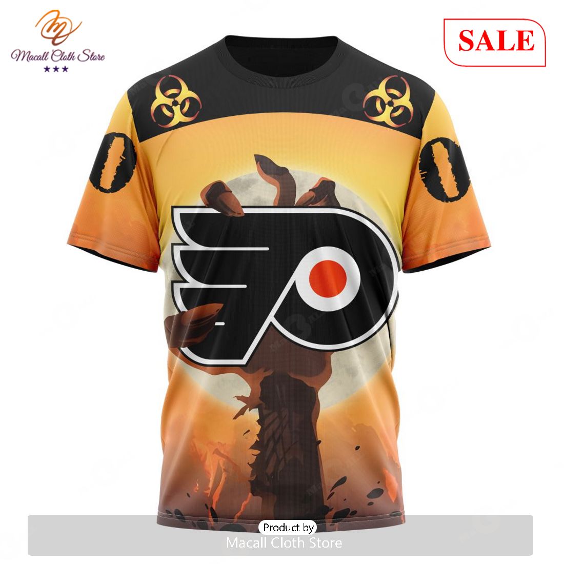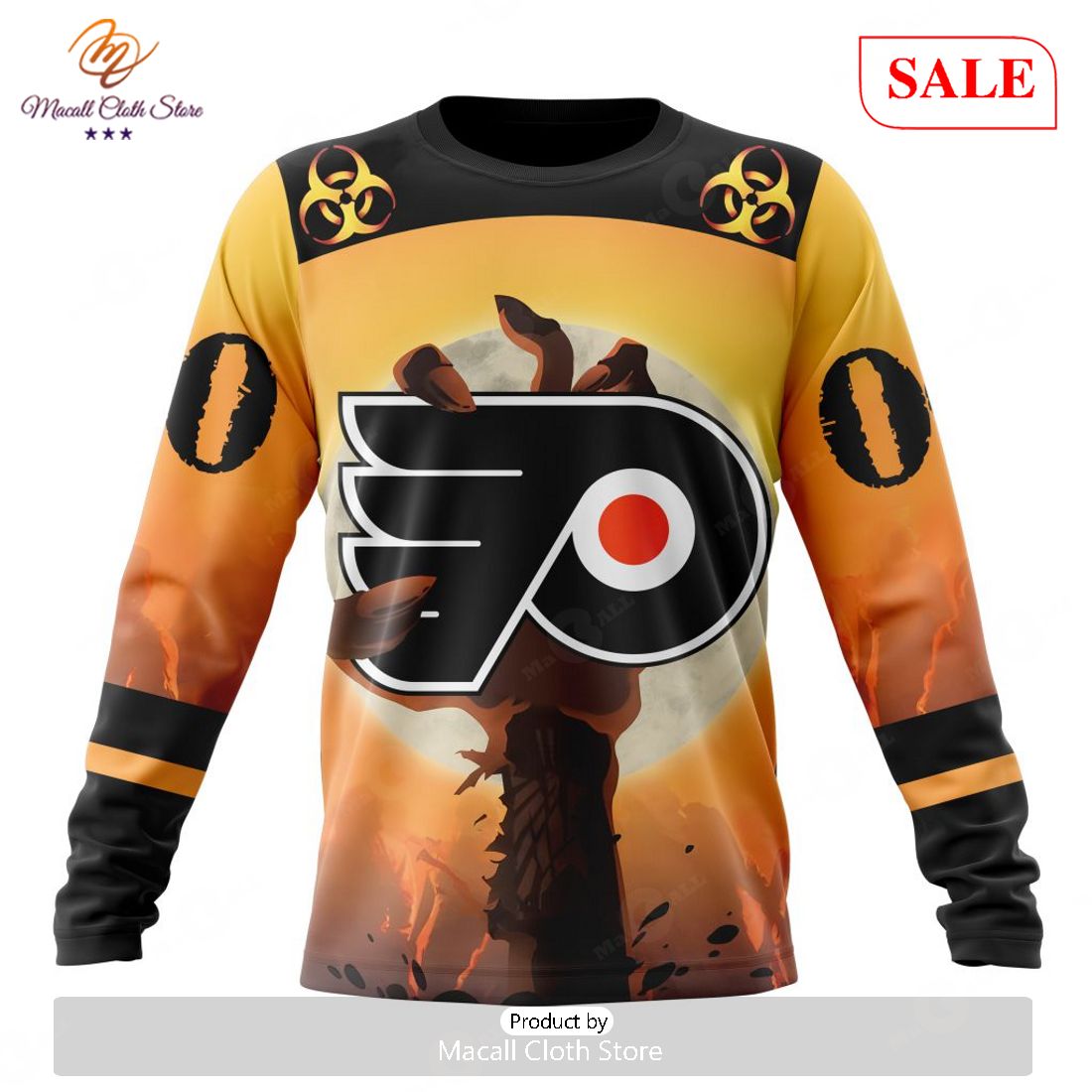 This SALE NHL Personalized Philadelphia Flyers Special Zombie Design For Halloween Hoodie Sweatshirt 3D is the perfect piece of wearable apparel to show off your love of the Philadelphia Flyers franchise. For the fan who loves Halloween, it features a spooky zombie design in Flyers colors and can be personalized with your name. The hoodie is made of polyester and cotton material and is machine washable for easy care. Its classic fit and long sleeves help achieve optimal comfort and stylish look, making it the perfect piece of apparel for any fan of the Philadelphia Flyers. It also makes for a great gift for a family member or friend who loves the Flyers.