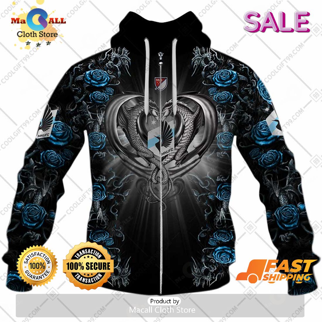 This amazing SALE Personalized MLS Minnesota United FC Roses Dragon Couple Hoodie Sweatshirt 3D is the perfect combination of style and comfort. Crafted out of high-quality fabric, it is not only comfortable but also stylish. It features a two-tone color scheme with an eye-catching design of a dragon couple with roses behind them. This hoodie features a front zipper closure and ribbed cuffs and hem. It also has an adjustable drawstring hood for extra protection. The personalization options available include name, number, team logo, and other special features. It is the perfect gift for any Minnesota United FC fan in your life.
